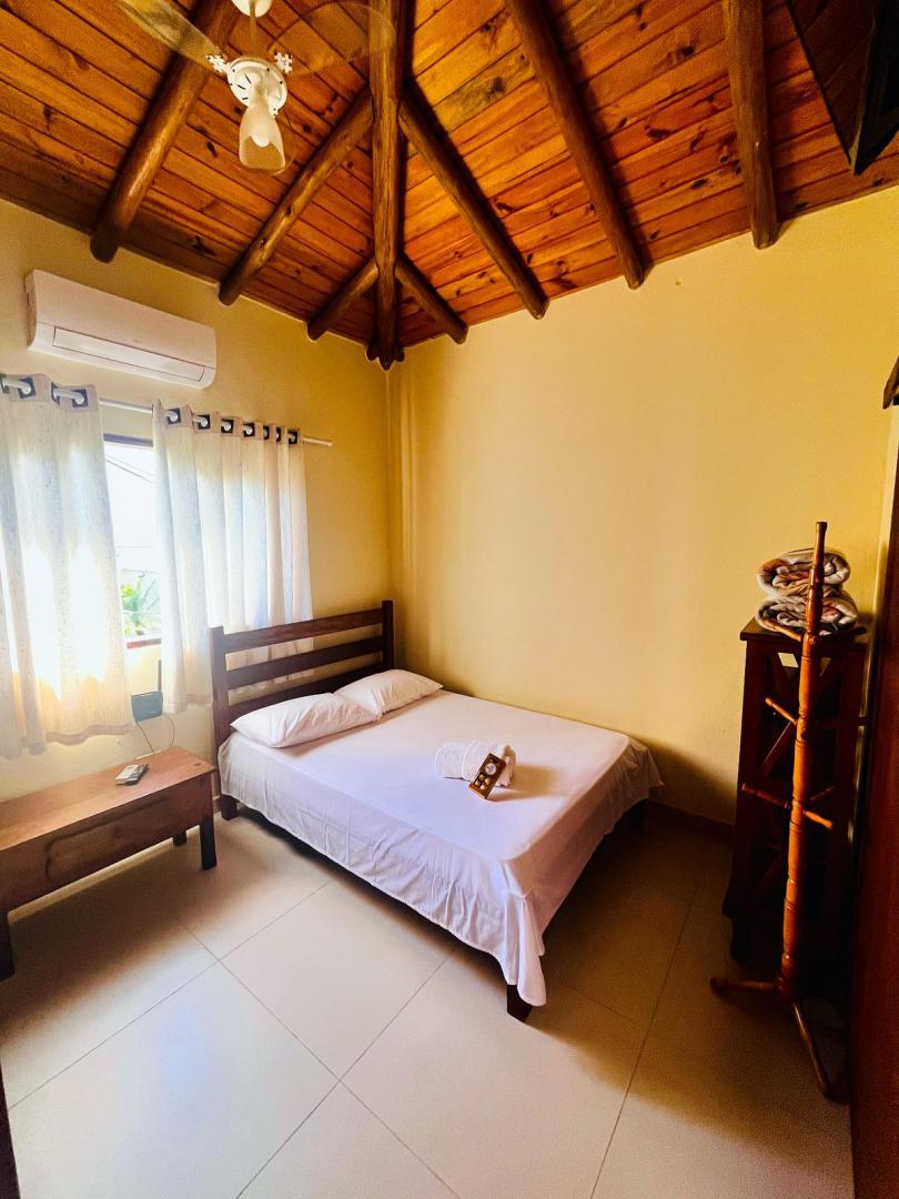 1 quarto com cama de casal ,uma beliche e uma cama auxiliar .